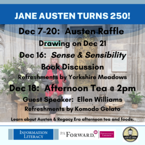 Jane Austen Turns 250 Years! Raffle, Book Discussion, & Tea! Events Run Until Dec 20..
